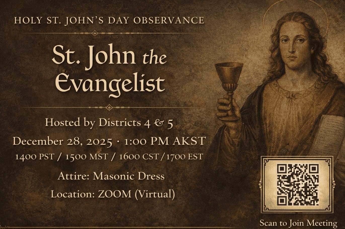 Freemasonry reinforces this lesson by anchoring its teachings in both the heavens and the cultivation of individual consciousness. Through ritual and reflection, the individual is reminded that growth begins within. Saint John the Evangelist stands as a symbolic guide in this process, emphasizing that truth is first discovered inwardly before it can be outwardly lived.